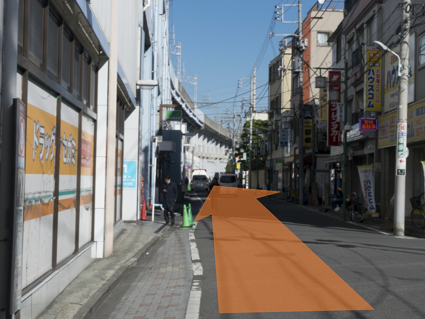 環七通りを足立方面へ向かい、奥戸橋を超えてすぐの交差点(青砥駅東交差点)を左手前方向に進み、100m先の右方向に店舗があります。さらに20m先、左側にコインパーキングがあります。